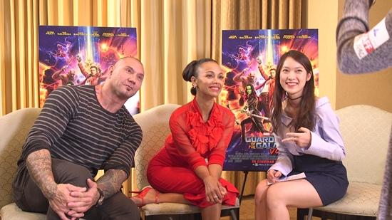 Khánh Vy chụp ảnh cùng Dave Bautista và Zoe Saldana.