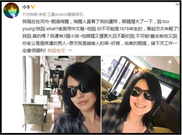 "Hiện tại tôi đang ở Hà Nội, vừa làm thủ tục xong, nhân viên hải quan sau khi nhìn ảnh trong hộ chiếu của tôi thì mở to mắt cảm thán 'quá trẻ', tôi đã phải hỏi lại 'gì cơ ?', sau đó anh ta dùng tiếng Trung và nói 'Cô không thể nào sinh năm 1987 được, quá trẻ', tôi khá ngạc nhiên và nói tôi hiện đã có 3 con rồi, anh ta càng không tin được và nói rằng 'chồng cô quả là một người đàn ông hạnh phúc'. Thì ra tôi là gu mà người Việt Nam thích, tuyệt quá, khởi đầu đã tốt đẹp, công việc nhất định thuận lợi !".