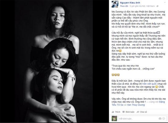 Trên trang cá nhân của mình cô chia sẻ cảm động: "Ngày 1/7/2014 là sinh nhật Bố. Ngày hôm ấy cũng là ngày cả nhà biết bố có khối u trong gan. Nín thở mừng sinh nhật Bố nhưng sau đó biết được tin không mấy tốt lành, ai cũng muốn sụp xuống nhưng ai cũng lại cố gắng mạnh mẽ để người khác nương tựa. Cả nhà gặp nhau là nước mắt lưng tròng. Chính lúc ý bố lại là người can đảm nhất. Dường như bố là người truyền cho chúng tôi nội lực, truyền cho chúng tôi niềm tin.