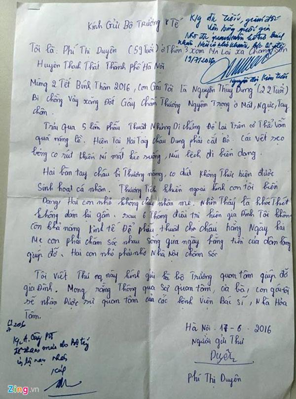 Đưa lại lá thư của người mẹ bất hạnh cho phóng viên Zing.vn, Bộ trưởng Tiến nhờ chuyển đến cho PGS.TS Nguyễn Gia Tiến, Giám đốc Viện Bỏng quốc gia để lên kế hoạch thăm khám và điều trị cho Dung.