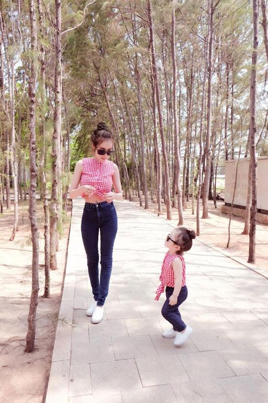 Trong những ngày đi dạo phố, đi chơi ngày xuân hè, bạn hoàn toàn có thể "thả dáng" với thời trang đồ đôi như mẹ con Elly Trần. Áo kẻ sọc crop top trắng pha đỏ vừa giúp tôn da, lại phần nào khoe khéo vòng eo thon thả. Quần denim, giày thể thao là những item tiện lợi cho cả trẻ con, người lớn đi lại hoạt bát, năng động, an toàn.