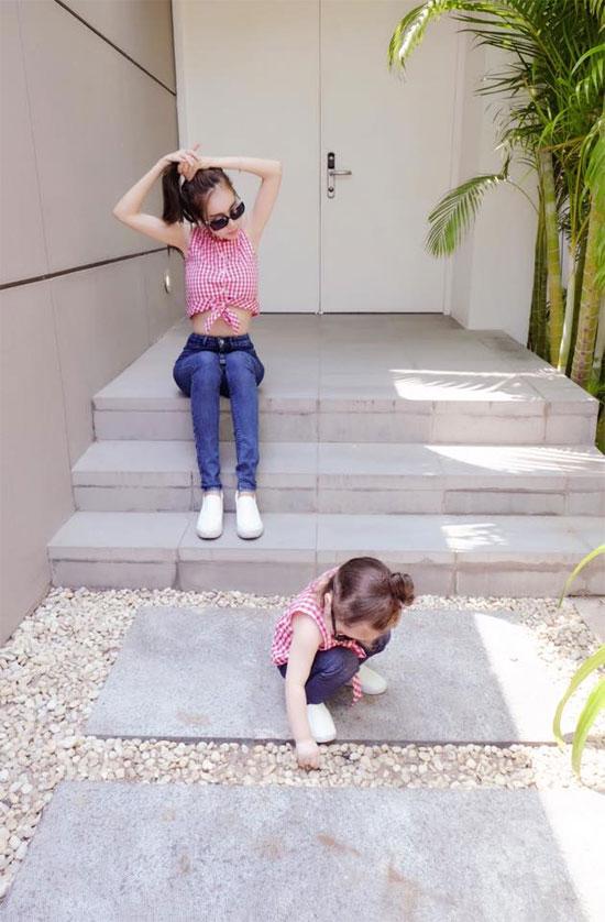 Diện bộ đôi quần denim, áo crop top kẻ sọc thắt nơ trước, giày trắng, kính đen, tóc búi chỏm, mẹ con Elly Trần toát lên diện mạo vô cùng sành điệu và hiện đại. Kiểu tạo dáng của hai mẹ con chẳng khác gì fashionista "chính hiệu".