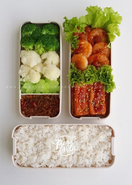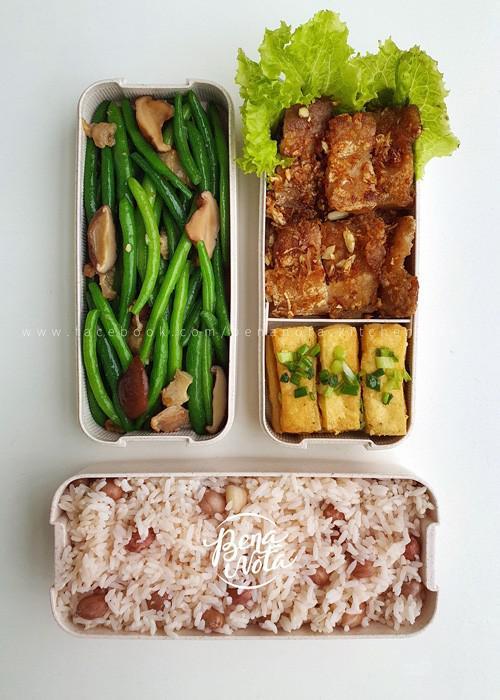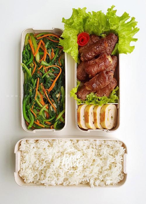 "Ví dụ, tôi có thể om mềm sườn trước rồi rán sơ, cá cũng vậy. Rau có thể nhặt sạch, bỏ vào hộp đậy kín. Tới sáng hôm sau chỉ cần đảo lại thức ăn mặn cho nóng, thêm chút gia vị, chế biến rau. Ngoài ra, tôi tranh thủ lúc rảnh để làm sẵn các món ăn kèm dự trữ được lâu như lạc chiên, kim chi. Do đó, tôi không mất nhiều thời gian buổi sáng để chuẩn bị cơm hộp cho chồng", chị bật mí.