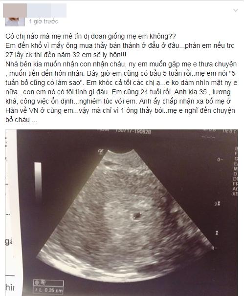 Có người lại khuyên, nếu tình hình căng thẳng quá thì giả vờ kiếm ông thầy bói khác, phán tốt vài câu, biết đâu lại thay đổi được suy nghĩ của bà mẹ. Vài mẹ bỉm lại tỏ ra bức xúc: "Việc gì phải buồn khóc, mạnh mẽ lên em, con cái là lộc trời cho, bao người muốn mà không có, thai cũng 5 tuần rồi, bỏ đi liệu sau này em có sống hạnh phúc được không? Cứ bảo gia đình bạn trai đến nói chuyện đàng hoàng, vợ chồng ly hôn vì hết duyên chứ đâu phải vì thầy bói".