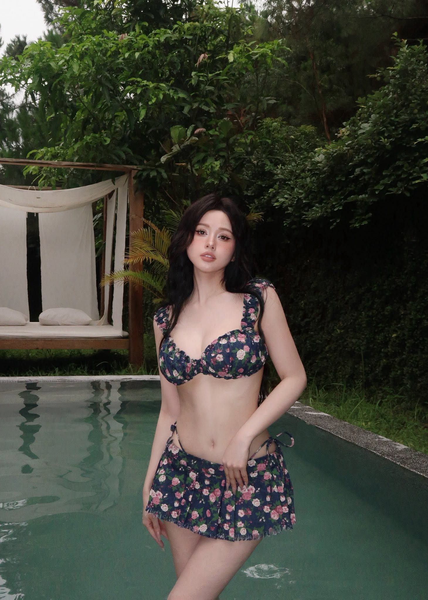 Khác với những bộ bikini cut-out tứ tung, lần này Tâm Tít lựa chọn thiết kế họa tiết hoa hai mảnh dịu dàng hơn nhưng vẫn phô diễn triệt để đường cong hình thể.