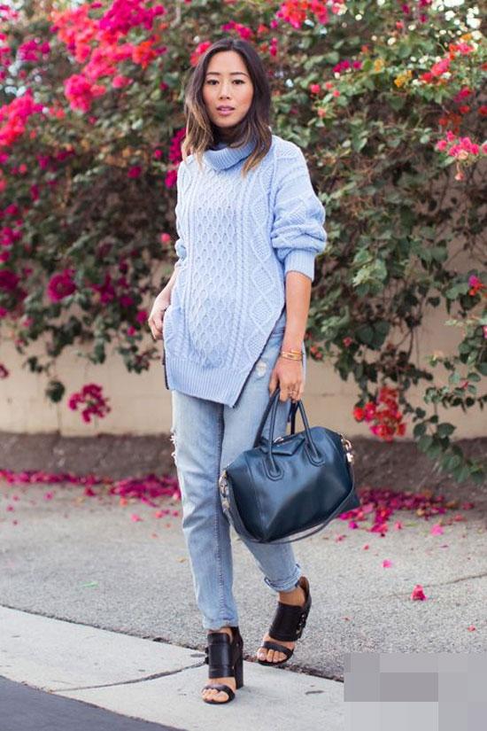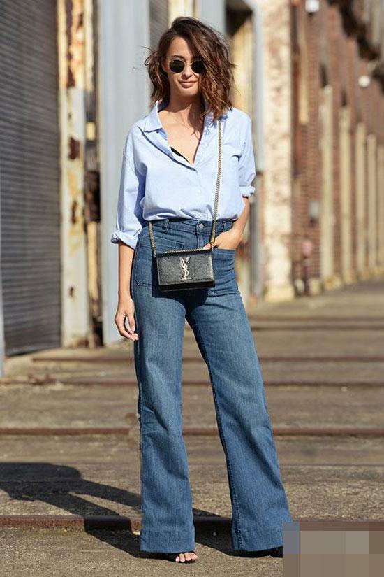 Một chiếc áo sơ mi màu xanh kết hợp quần jeans dáng suông sẽ giúp bạn
