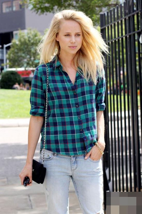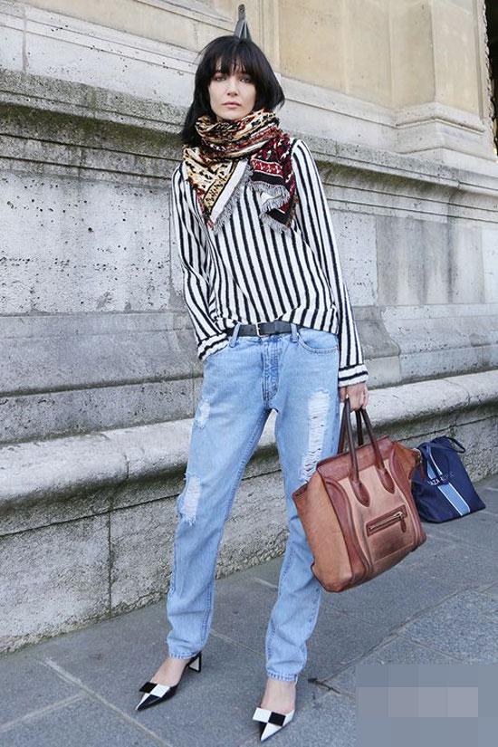 Với áo sơ mi kẻ sọc, bạn có thể thoải mái kết hợp cùng quần jeans rách,