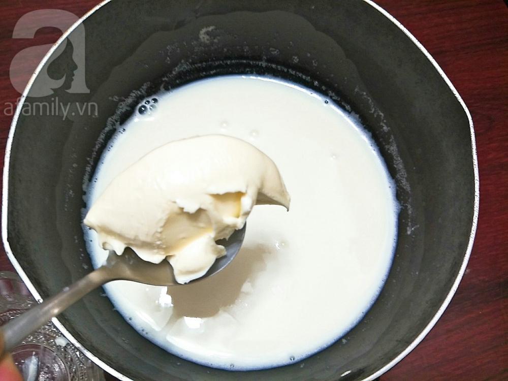 Khi sữa đã hòa tan thì cho cream cheese vào khuấy đều cho phô mai tan hết.