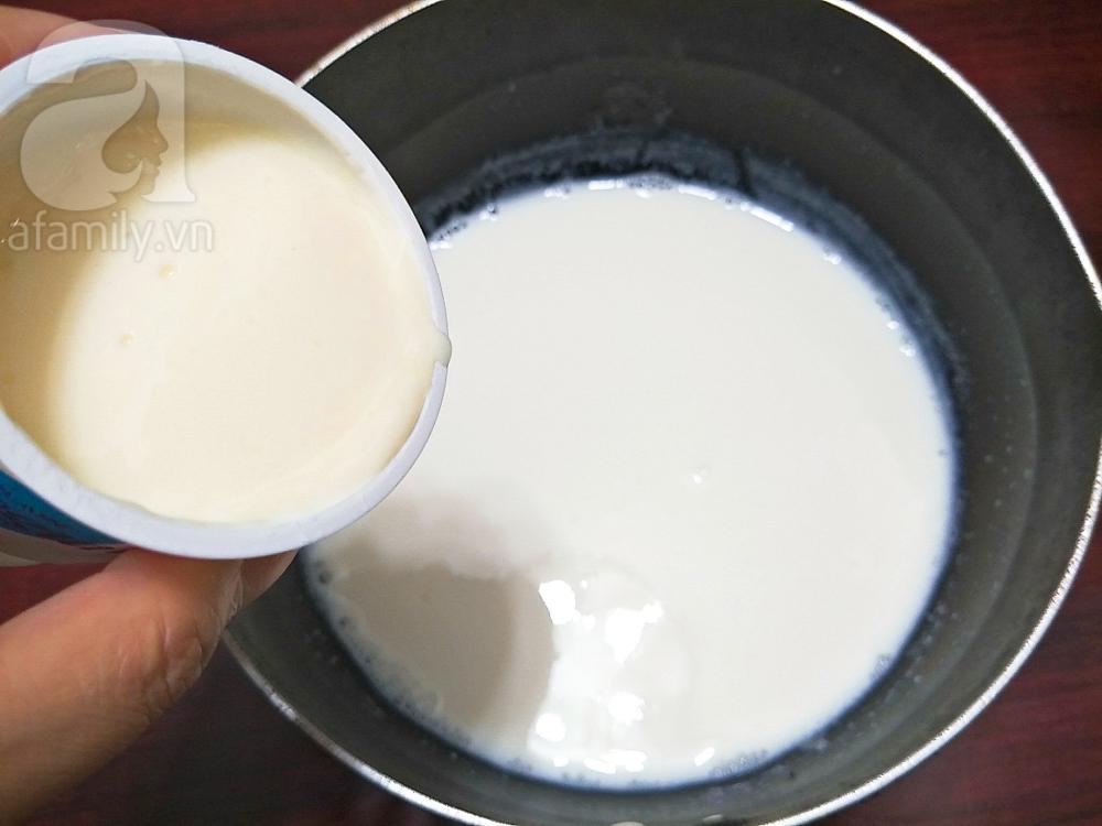 Tiếp đến bạn cho sữa tươi vào và khuấy đều lên. Cuối cùng bạn cho sữa chua cái vào, khuấy đều hỗn hợp 1 lần nữa là xong.