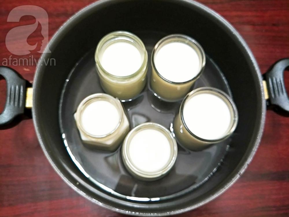 Cho nước ấm vào 1 cái nồi sau đó đặt các hũ sữa chua vào nồi để tiến hành ủ sữa. Thời gian ủ sữa vào khoảng 8-10 tiếng sau đó bạn cho các hũ sữa chua phô mai vào ngăn mát tủ lạnh dùng dần.