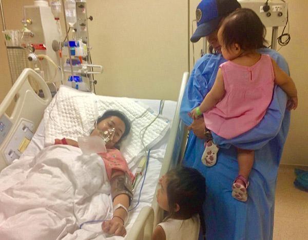 Chị Hoàng Hạ - người mẹ đã một thân ôm hai con lao đi giữa biển lửa hiện vẫn đang điều trị tại Bệnh viện Quốc tế Thành Đô (CIH) sau thảm kịch rạng sáng 23/3. (Ảnh: Thiên Chương)