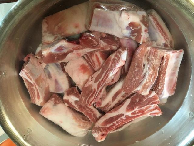Sườn rửa sạch, chặt miếng, cho vào nồi nước lạnh, pha thêm 1 muỗng cafe muối.