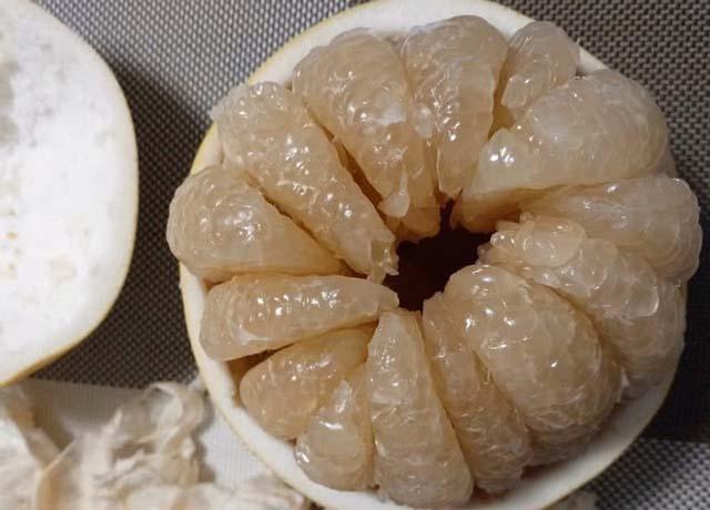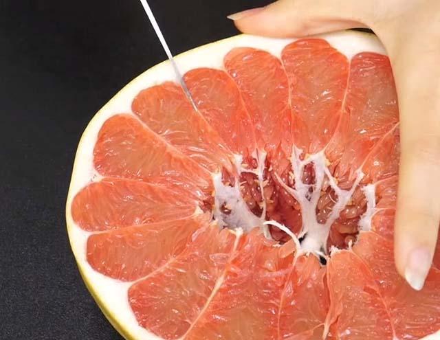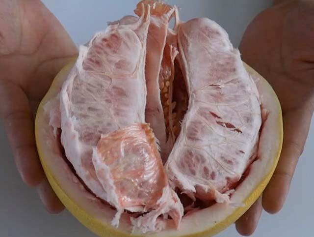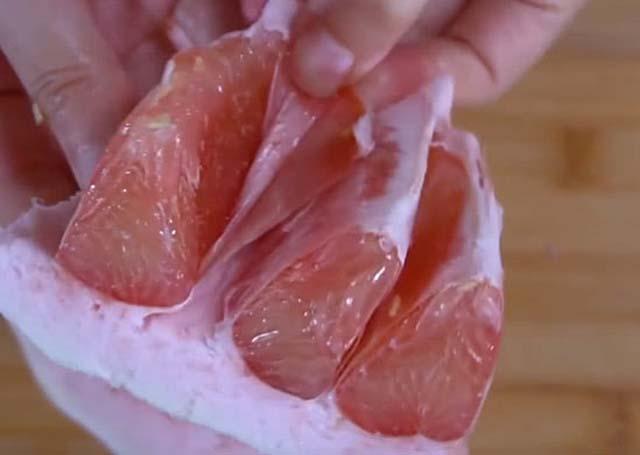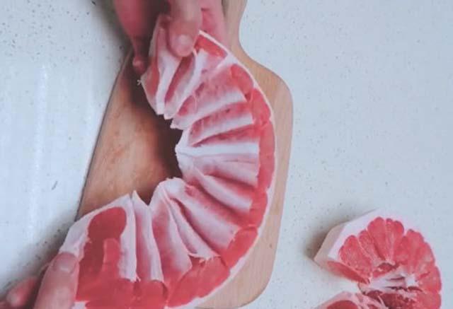 Với cách làm này, thịt bưởi được lấy ra rất nhanh và sạch, hoàn toàn không dính mảng trắng bám vào. Múi bưởi lúc này rất đều, chặt, không bị rơi ra. Với cách làm này chị em chỉ tốn khoảng 2 phút là đã bóc xong một quả bưởi.