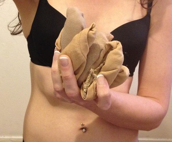 Đây có thể coi là một cách độn ngực thủ công. Sau khi mặc áo ngực, bạn hãy dùng tất chân để độn vào phía bên sườn áo ngực, sao cho ngực của bạn được nâng lên, tạo thành bờ ngực hoàn hảo.