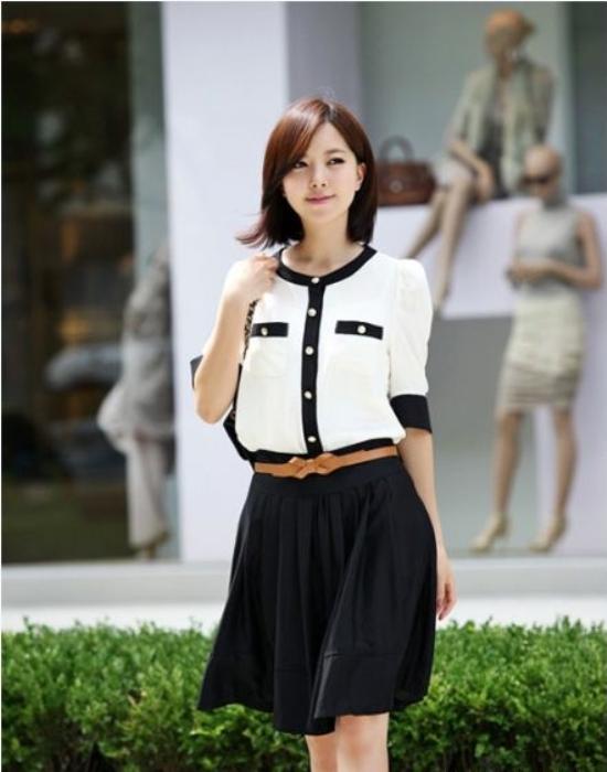 Với váy ngắn, bạn nên chọn độ dài váy vừa chấm đầu gối, để giúp bạn nhìn cao hơn và không lộ nhược điểm. Các màu tối, dáng váy xếp li, cắt xéo cũng giúp cho phần đùi nhẹ nhàng hơn nhiều.