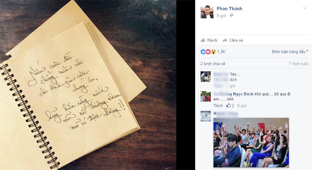Phan Thành khá tâm trạng khi đăng tải lời bài hát "Anh cứ đi đi" đang được nhiều bạn trẻ yêu thích.