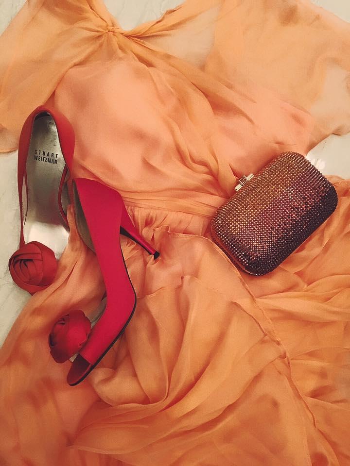 Midu chia sẻ trang phục mình sẽ diện trong event tối nay: váy voan của nhãn hàng Badgley Mischka, giày cao gót màu đỏ đính hoa hồng của Stuart Weitzman và sắc tay đình đám sang chảnh của thương hiệu Judith Leiber.