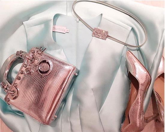 Túi xách Dior tông hồng có giá khoảng 100 triệu đồng khá hợp với phong cách nữ tính, dịu dàng của Midu.