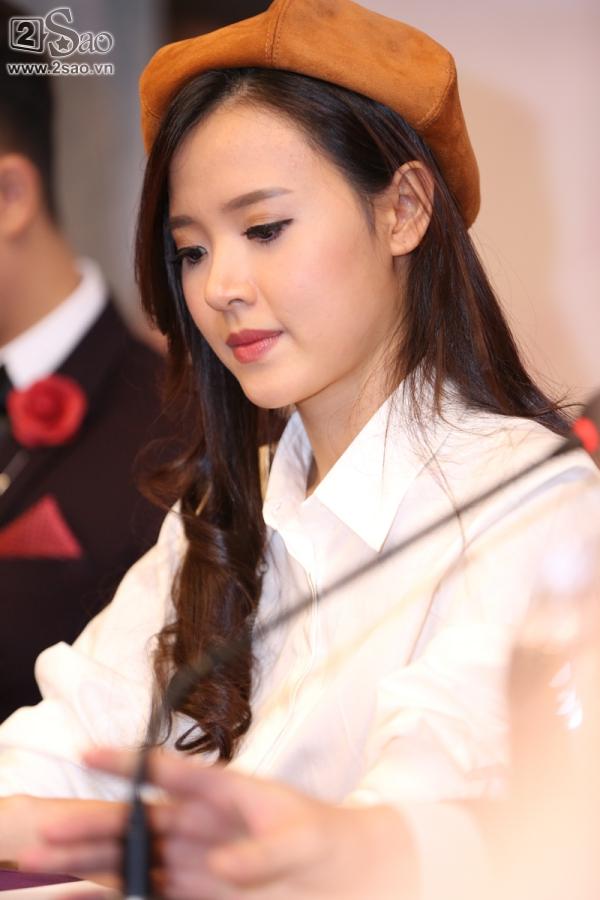 Xuất hiện tại buổi họp báo, Midu thanh lịch với váy trắng mix cùng mũ beret. Vẻ ngoài