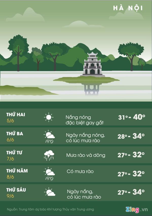 Cơ quan khí tượng dự báo ngày mai 5/6, nắng nóng gay gắt tiếp tục xảy ra ở Bắc Bộ và các tỉnh Thanh Hóa - Phú Yên do tác động của vùng áp thấp nóng phía Tây kết hợp với hiệu ứng gió phơn còn hoạt động mạnh. Nhiệt độ cao nhất trong ngày phổ biến 37-39 độ C, có nơi trên 40 độ C. Thời gian nhiệt độ trên 35 độ là 10-18h.