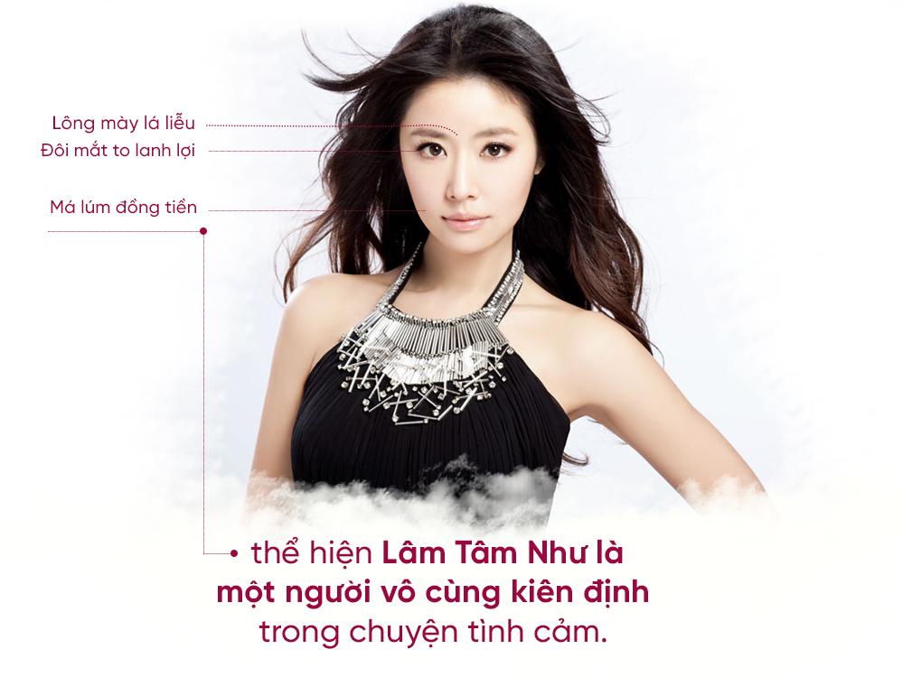 Nàng hoa đán có khuôn miệng mỏng, đường nét rõ ràng, môi trên có vân, hai môi cân xứng, sắc môi hồng nhuận, nhân trung (khoảng cách từ đầu môi đến chóp mũi) có hình tam giác là tướng miệng phú quý. Người phụ nữ có tướng miệng này ắt là người thông minh, nhân hậu, tài năng hơn người, thành công trong sự nghiệp và có địa vị trong xã hội. Mũi nàng Lâm hình túi mật treo, là điển hình của phụ nữ mạnh mẽ. Trong nhân tướng học, phụ nữ có tướng mũi này thường rất thật thà, ý chí kiên cường, làm việc gì cũng cố gắng tới cùng. Cũng chính vì bản tính này, họ thường là hậu phương vững chắc cho chồng, cho dù vất vả khó khăn cũng không nề hà dừng bước. (Nhân tướng học – Hy Trương) Nét mặt này cho thấy trời sinh Hoắc phu nhân là một người khá đào hoa. Tuy nhiên, lông mày lá liễu, đôi mắt to lanh lợi và má lúm đồng tiền góp phần thể hiện nàng lại là một người vô cùng kiên định trong chuyện tình cảm, chỉ cần yêu thương thì sẽ hết lòng hết sức. |