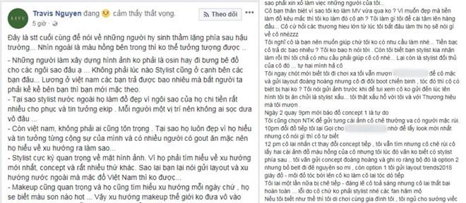 Stylist gốc Hà thành còn bức xúc với việc Minh Hằng âm thầm hợp tác cùng một stylist khác. Thậm chí Travis Nguyễn còn tố Minh Hằng là người "thiếu tôn trọng ê-kíp, keo kiệt và vô ơn".