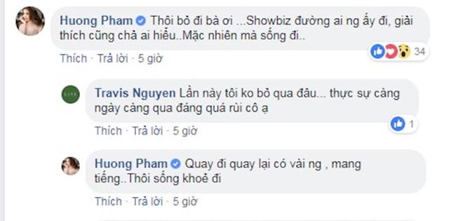 Phía dưới trạng thái của Travis Nguyễn, Hoa hậu Phạm Hương nhanh chóng để lại bình luận khuyên anh bỏ qua mọi chuyện. Đáp lại lời khuyên của Hoa hậu Hoàn vũ 2015, Travis Nguyễn khẳng định không buông xuôi vì mọi chuyện "càng ngày càng quá đáng".