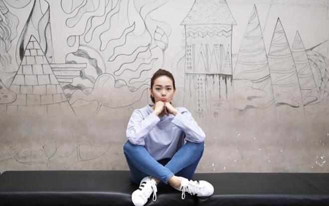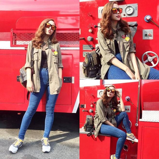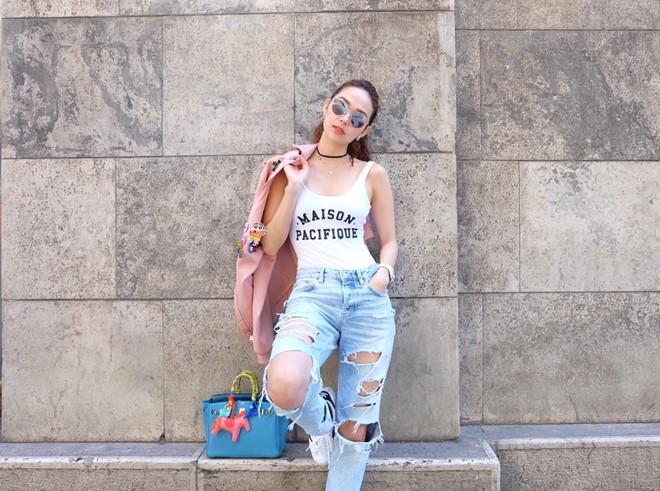 Jeans rách và áo thun in chữ giúp Minh Hằng ăn gian tuổi.