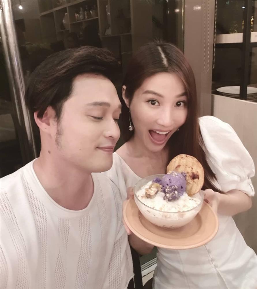 Đăng tải hình ảnh bên nam ca sĩ Quang Vinh, Diễm My bảo: "Thực sự trời nóng như này chỉ cần 1 tô kem tím rịm khoai môn đá bào này thôi".