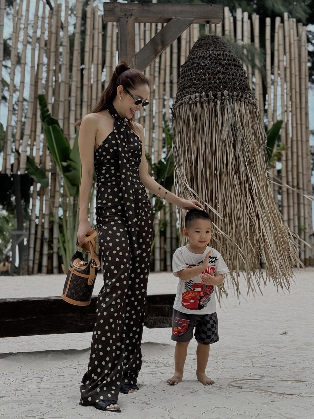 Trong hình, chị đẹp gây sốt khi khoe vóc dáng mẹ một con trông mòn con mắt. Trong khi đó, nhóc tỳ Quốc Huy được nhận xét là sao y bản chính của ba Quốc Bảo. Quý tử sở hữu gương mặt bụ bẫm, khôi ngô, cực kì đáng yêu.