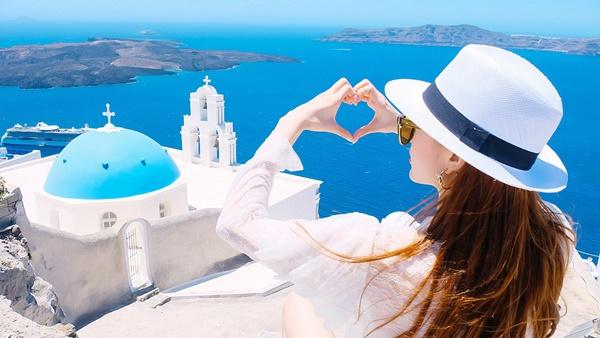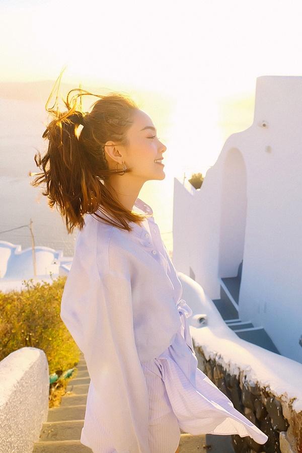 Minh Hằng tự thưởng chuyến du lịch cùng gia đình ở đảo Santorini, Hy Lạp. Cô không quên ghi lại hình ảnh xinh đẹp rạng rỡ