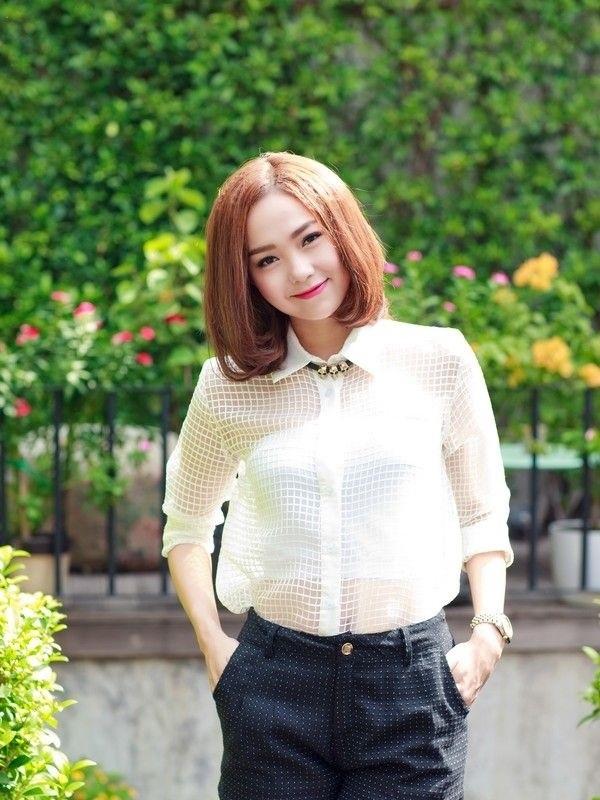 Minh Hằng trẻ trung với mái tóc bob biến thể, dập xù nhẹ nhàng phần đỉnh đầu.