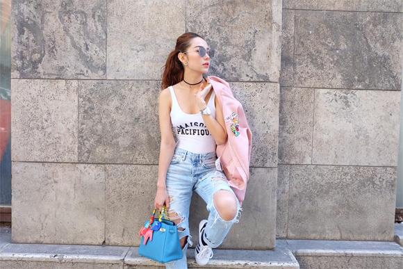 Minh Hằng kết hợp áo bomber hồng phấn với tank top, quần jeans rách độc đáo.