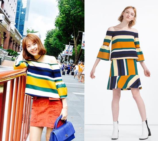 Cô khoe vai trần với áo trễ vai kẻ sọc ngang bắt mắt. Kiểu áo này thích hợp cho