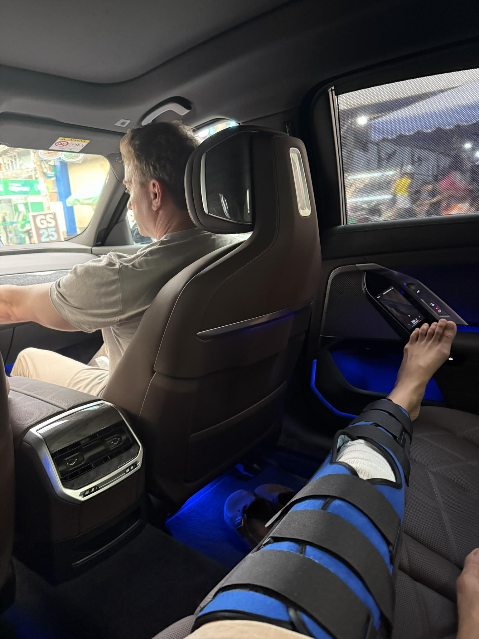 Trong clip, siêu mẫu còn để lộ khoảnh khắc được ông xã chăm sóc tận tình. Người đẹp cập nhật tình hình hiện tại sau khi bị đứt dây chằng đầu gối. Theo đó, cô phải băng bó, đi lại khó khăn. Chân dài cảm thấy may mắn vì luôn có chồng đồng hành.