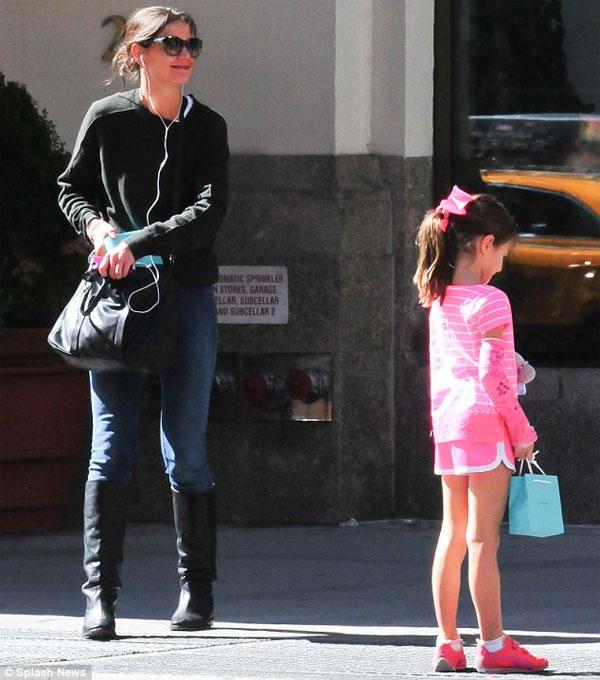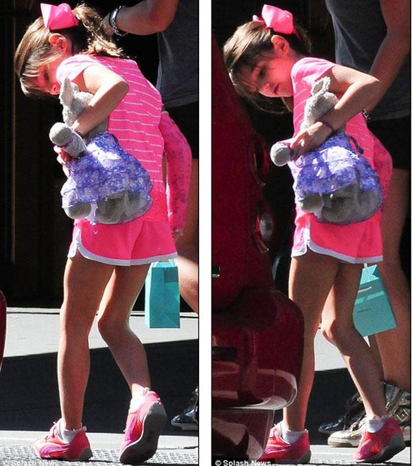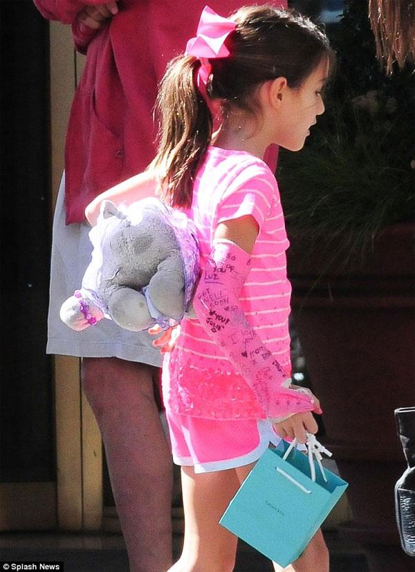 Thời gian gần đây dường như mẹ Katie Holmes đang rất cưng chiều bé Suri. Sau khi cô bé 7 tuổi được mẹ tặng cho điện thoại Iphone thì hôm chủ nhật bé lại được mẹ đưa đi mua sắm tại cửa hàng trang sức nổi tiếng Tiffany & Co ở New York. Vẫn diện đồ gam màu hồng yêu thích, Suri chọn áo phông hồng, quần short hồng, nơ hồng, giày hồng và thậm chí vải bó tay cũng màu hồng. Trong khi đó mẹ Katie Homles trông giản dị với quần bò, bốt cao cổ và áo đen.