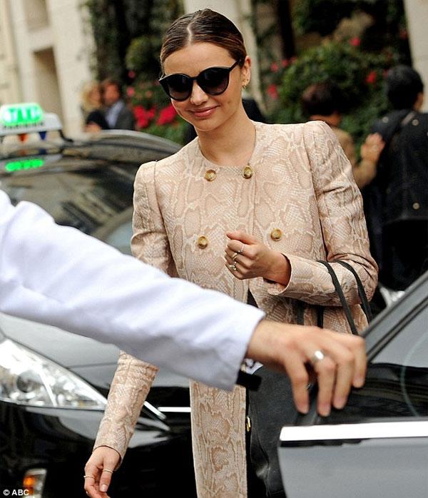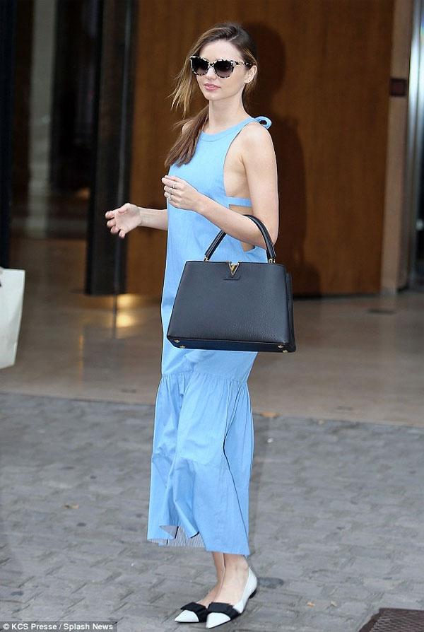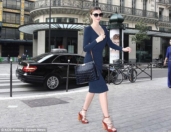 Cuối tuần qua siêu mẫu 30 tuổi người Úc tới Paris để tham dự Tuần lễ thơi trang và nhân đây cô cũng dành thời gian đi mua sắm một số nơi. Diện chiếc váy màu xanh tím than thiết kế cổ tìm khoét sâu ngực, khoét lưng, cô trông như một quý cô sang trọng, quyền quý và gợi cảm nổi bật trên kinh đô thời trang hoa lệ.