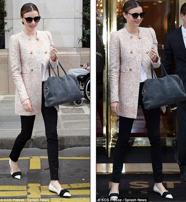Cũng tại đây, Miranda gây chú ý về phong cách rời khỏi khách sạn nơi mình ở với trang phục thanh lịch, quần bó kết hợp áo khoác hoạ tiết da rắn và kính đen, tóc búi.