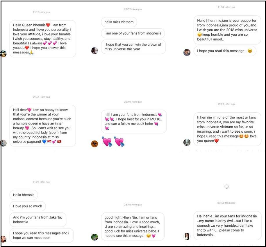 Trước đó, vào đúng dịp 8/3, đương kim Hoa hậu Hoàn vũ Việt Nam bất ngờ nhận được rất nhiều tin nhắn chúc mừng từ người hâm mộ tại Indonesia. Trong số đó, nhiều fans còn bày tỏ hy vọng H'Hen Niê sẽ giành chiến thắng tại cuộc thi Hoa hậu Hoàn vũ Thế giới 2018.