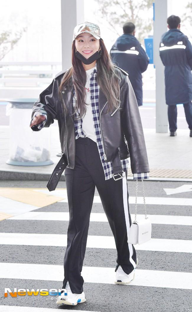 Xuất hiện tại sân bay, Hyorin khoe style cá tính cùng cách mix đồ layer trong chiếc jacket oversize khoác ngoài sơmi caro và áo thun trắng kết hợp quần thể thao kẻ sọc chuẩn xu hướng.