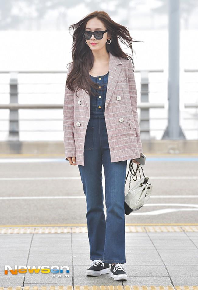 Jessica mạnh bạo kết hợp quần yếm denim với blazer kẻ hot hit, giầy sneaker tưởng như chẳng ăn ý mà lại đẹp bất ngờ.