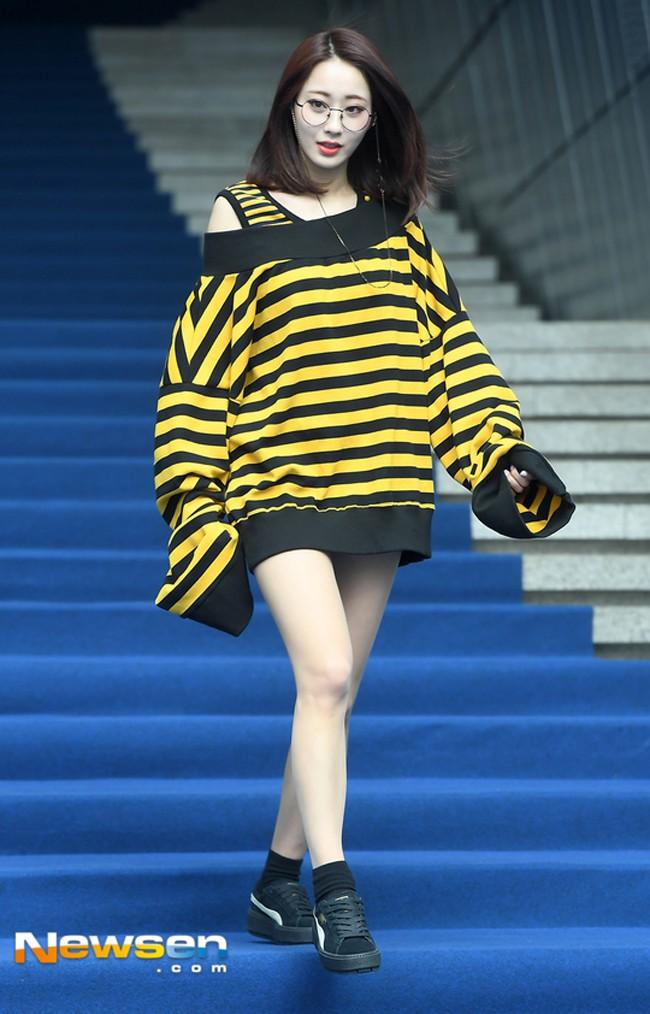 Hyomin (T-ara) rườm rà với chiếc áo tay bồng nhiều chi tiết. Cũng mặc theo style giấu quần nhưng nữ ca sĩ lại để lộ nhược điểm đầu gối củ lạc.
