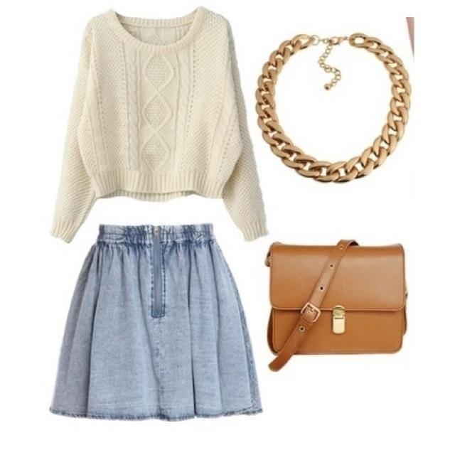 4. Chân váy denim mix với áo len vặn thừng màu be kết hợp với phụ kiện vòng cổ kim loại tinh tế và túi xách đeo chéo, trông bạn vẫn cực kì nữ tính nhưng không kém phần trẻ trung, năng động.