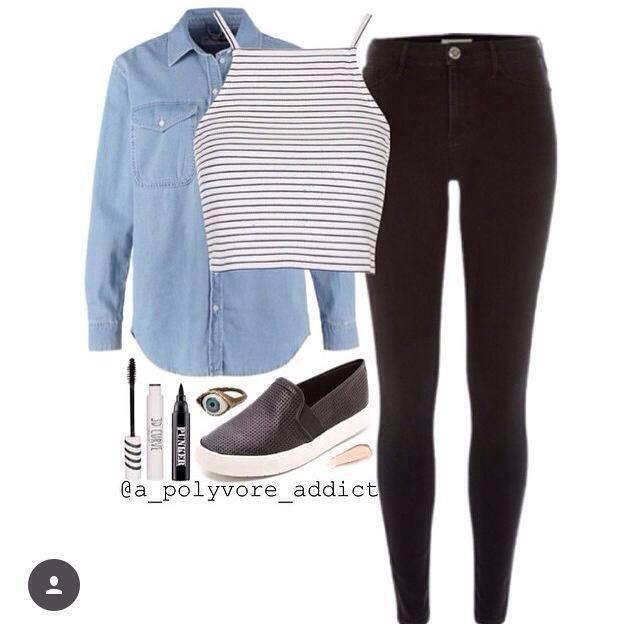 5. Sơmi denim quen thuộc màu xanh kết hợp áo yếm mix bên trong, cùng quần skinny đen và đôi giầy slip on. Set đồ không bao giờ lỗi mốt này sẽ giúp bạn cảm thấy thoải mái và tự tin ở bất cứ nơi đâu.