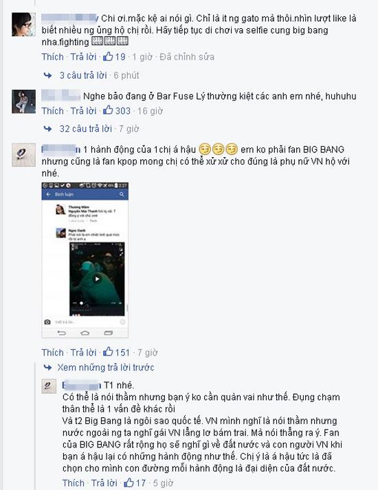Fan Việt còn vào trang cá nhân của Tú Anh để chỉ trích những hành động thân mật của Á hậu với chàng ca sĩ xứ Hàn tối hôm qua: "Đứng dưới quẩy là được rồi. Còn cố tình lên quầy DJ bám vai các thứ, mệt kinh."; "Chị ơi, chị giữ nết làm Á hậu đi nhé. Trong các bài phỏng vấn, Seungri đã nói: Tôi ước fan bớt đụng chạm. Chị làm ơn đi chị. Bọn em gato ừ đúng. Nhưng chị làm cho hình ảnh con gái Việt trở nên dễ dãi và vô duyên chết đi được".