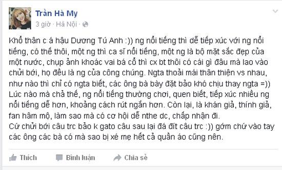 "Xem mấy cái video live em thấy chị có vẻ hơi thân mật quá lố. Thật tình là em chưa thấy kiểu bạn bè nào mà hành động thân mật như vậy. Em biết chị vui nhưng dù sao chị cũng là 1 á hậu, vì thế hãy cẩn thận và suy nghĩ kĩ càng trước khi hành động nhé."