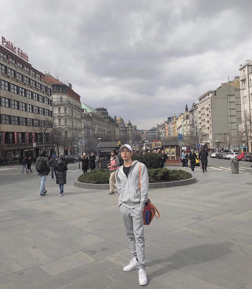 Erik khoe street style khỏe khoắn trong bộ đồ thể thao mix giầy sneaker.