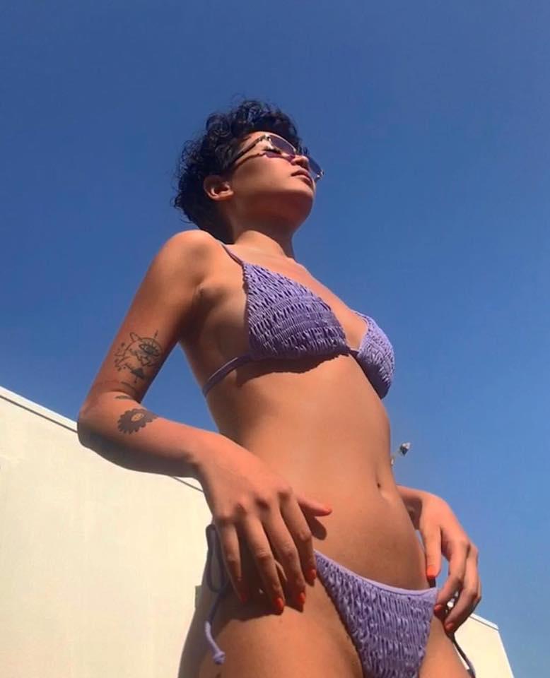 Bikini hai mảnh sắc tím hot trend tôn trọn làn da nâu của Louis Hà. Không chạy đua hình ảnh "bánh bèo" của nhiều hot girl khác, Louis Hà vẫn giữ nét cá tính của riêng mình.