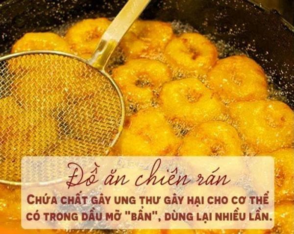 Các món ăn như: bánh rán, bánh gối, nem… rất được các bạn trẻ ưa chuộng bởi sự đa dạng và giá thành thấp. Nhưng ít ai chú ý đến việc đa số các quán ăn vỉa hè đều dùng đầu mỡ chiên đi chiên lại để chế biến đồ ăn. Lúc này, dầu ăn xuất hiện các andehit có hại gây nguy cơ ung thư khi tích tụ nhiều trong cơ thể. Không kể đến nhiều cơ sở vì lợi nhuận còn dùng dầu mỡ “bẩn” không rõ nguồn gốc rất nguy hiểm cho sức khỏe.