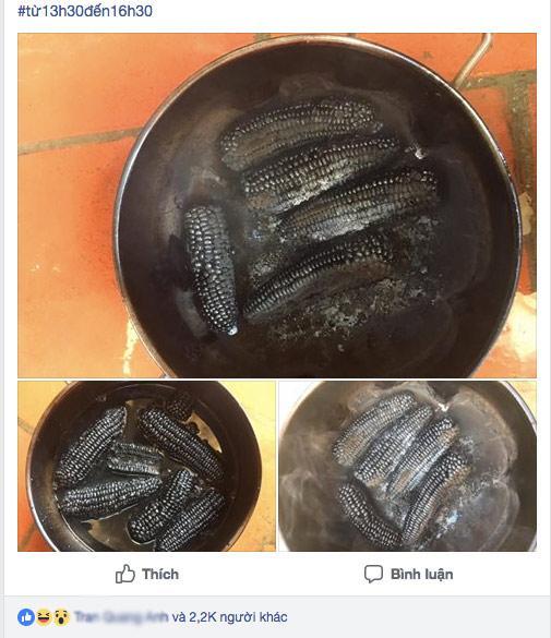 Trong bức ảnh, chiếc nồi cháy đen trơ đáy với 3 bắp ngô nổi bật một màu đen óng ả khiến nhiều người không nhịn nổi cười.